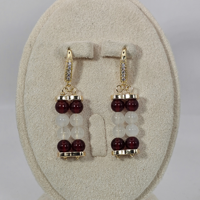 Designed with 6mm Carnelian and White Jade beads, these earrings are set on stainless steel ear wires. It is believed that Carnelian inspires confidence and courage, while White Jade brings serenity and balance.