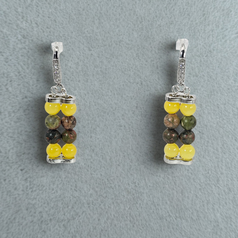Crafted with 6mm Unakite and Yellow Angelite beads, these earrings are designed on stainless steel ear wires. It is believed that Unakite encourages emotional balance, while Yellow Angelite promotes harmony, compassion, and gentle healing.